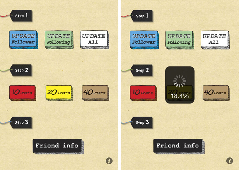 Após o login, é necessária a coleta dos dados da sua conta para o aplicativo isso pode levar alguns minutos mas vale a pena a espera.  No 1°passo você pode optar por atualizar individualmente dados dos seguidores ou seguidos mas recomendo a atualização geral para evitar informações imprecisas no relatório final. No 2° passo a coleta das informações sobre “curtir” e “comentários” dos posts, se você publica com muita frequência considere a maior opção (40 posts). O 3° passo é o link para o relatório  e o icone “i”  (no canto direito inferior) contém as informações do aplicativo, contato com o desenvolverdor e logout – Ambas as telas abaixo: