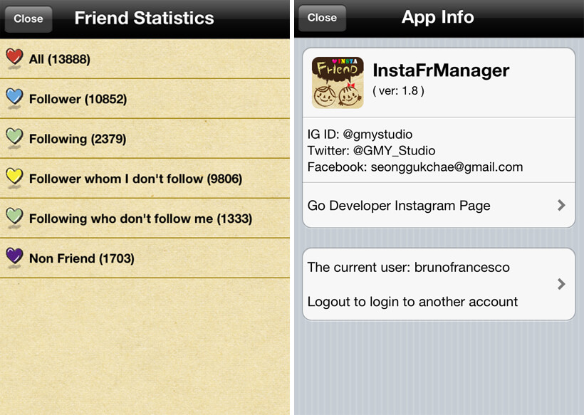 O InstaFrManager (app em inglês para Iphone) fornece informações detalhadas do seu perfil no Instagram. Você pode acompanhar o desempenho da sua conta e otimizar sua base de seguidores. Com uma interface simples e intuitiva, ele é fácil de usar mesmo pra quem não sabe quase nada de inglês. Utilizo esse aplicativo a alguns meses e ele vem passando por constantes melhorias. Veja abaixo as telas e suas funcionalidades: