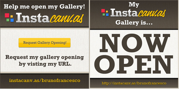 Para abrir a sua galeria, você precisa solicitar usa url efetuando o login no site do Instacanvas com sua conta do Instagram. Depois você deve fazer uma “campanha” com seus seguidores para que eles votem na abertura da sua galeria, para isso o site oferece opções de compartilhamento (Twitter, Facebook ,Google Plus e Pinterest ) e uma imagem explicando o que os interessados precisam fazer. Se sua campanha for bem, você será selecionado pela equipe do Instacanvas que enviarão instruções para configurar sua página e uma nova imagem para compartilhar o status da sua galeria.